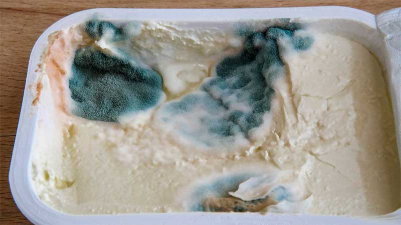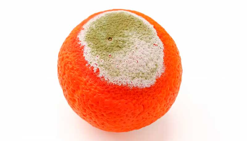 El verde, por su parte, es un color común en alimentos enmohecidos. Contrario a la creencia popular, cortar la parte visiblemente afectada no es suficiente, pues las raíces del hongo (el micelio) ya se han extendido por todo el alimento. Los principales culpables suelen ser especies de Aspergillus, que bajo el microscopio recuerdan a la parte hinchada de un diente de león convertido en semilla.