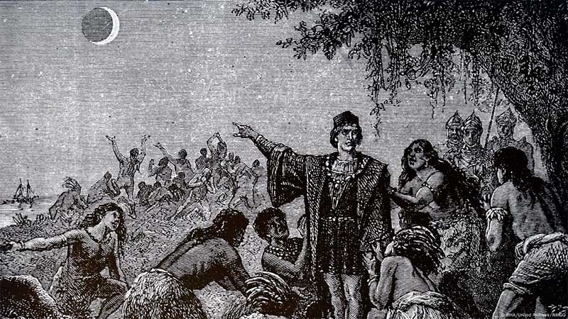 Pero Colón contaba con una ventaja. Poseía tablas astronómicas del matemático alemán que respondía al seudónimo latino de Regiomontanus, donde estaba previsto que el 29 de febrero de 1504 se produciría un eclipse total de Luna. El almirante anunció a los jefes arawak que su dios borraría la Luna si no colaboraban dándoles comida. Efectivamente, aquella noche la Luna se tornó rojiza al entrar en la sombra de la Tierra. Presos del pánico, los nativos rogaron a Colón que "devolviera" la Luna a su estado normal.
