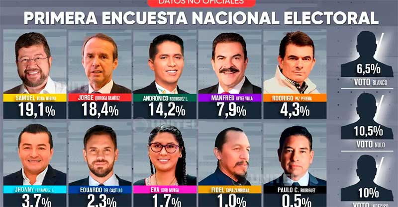La red Unitel ha dado a conocer la noche de este domingo una encuesta realizada en todo el país, en la que se muestra que la derecha toma los primeros lugares con Samuel Doria Medina y Jorge Quiroga a la cabeza, mientras que la izquierda con Andrónico Rodríguez se coloca en tercer lugar.