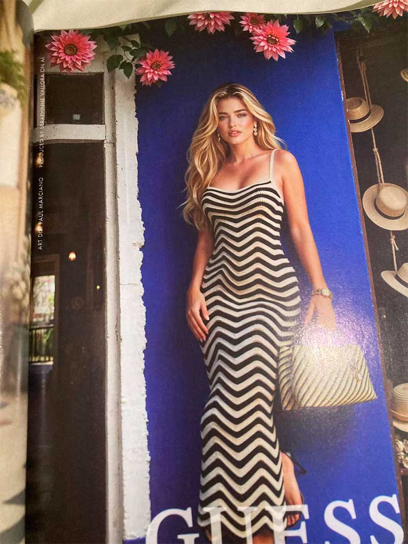 El anuncio de dos páginas de la marca Guess presenta a una modelo rubia que aparece en dos escenarios distintos: sentada en un café con un mono floral azul claro, y posteriormente apoyada contra una pared azul con un vestido de rayas en zigzag en blanco y negro, con un bolso a juego de la marca. Solo una pequeña línea en letra diminuta revela la naturaleza artificial de la modelo: “Seraphinne Vallora on AI”.