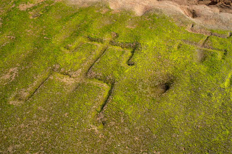 Durante la marea baja, las olas suaves dejan al descubierto las tallas, mientras las algas verdes acentúan los contornos de los grabados.