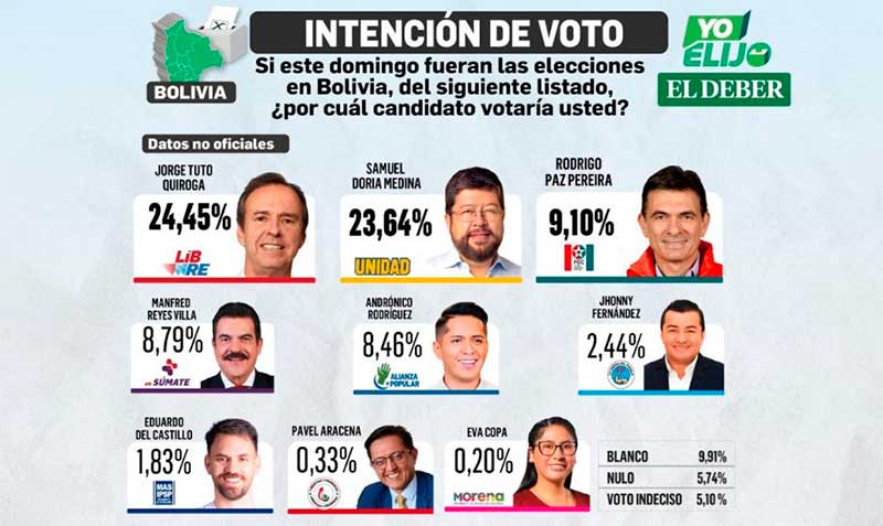La cuarta encuesta nacional de intención de voto, presentada por EL DEBER pone a Jorge Quiroga en primer lugar con un 24,45%, mientras que Doria Medina alcanza un 23,64%, una diferencia de 0,81 puntos porcentuales.