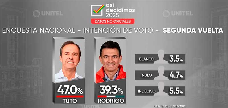 La primera encuesta de Unitel con miras a la segunda vuelta electoral, pone a Jorge Quiroga como ganador del balotaje con una intención de voto que supera la diferencia con un 7,7% frente a Rodrigo Quiroga.