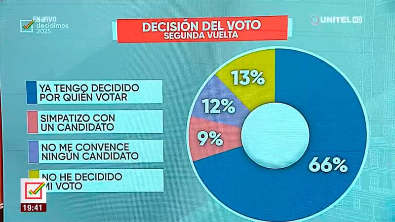 En esta primera encuesta para la segunda vuelta también se buscó conocer si los electores ya tienen decidido su voto. El 66% manifestó que ya tenía decida su elección y el 9% señaló que simpatizaba con un candidato.