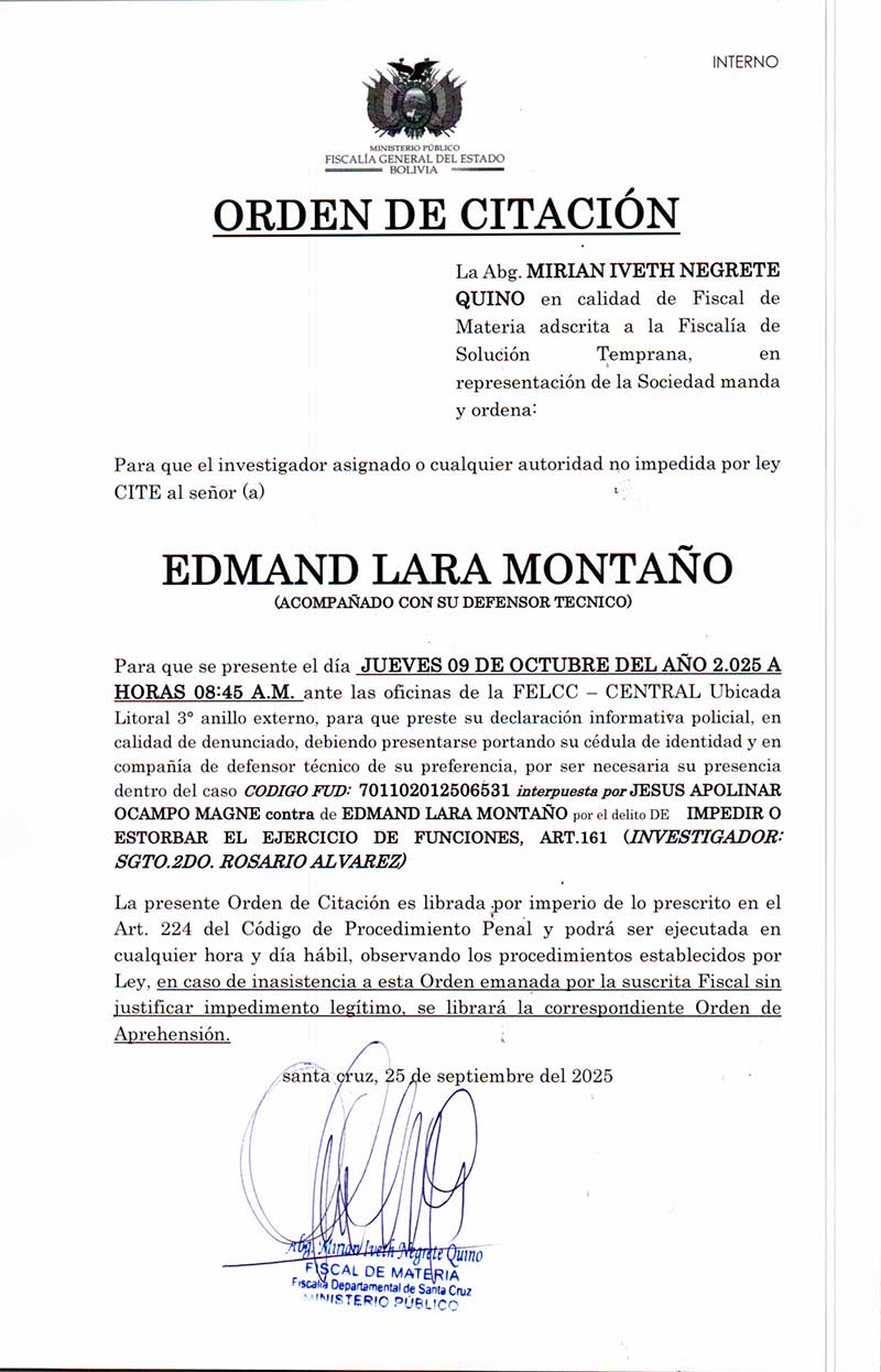La Fiscalía Departamental de Santa Cruz citó a declarar a Edmand Lara para el próximo jueves 9 de octubre a las 08:45 en oficinas de la Fuerza Especial de Lucha Contra el Crimen (FELCC), en calidad de denunciado.