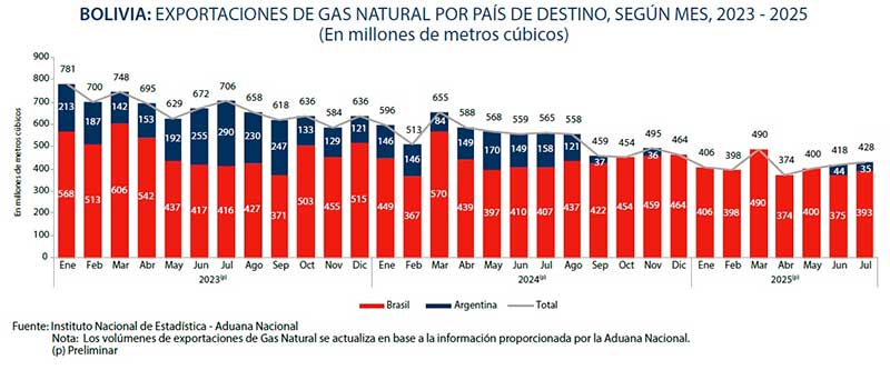 Según un Boletín Sectorial de Hidrocarburos del Instituto Nacional de Estadística (INE), los datos muestran que Brasil demandó 393 MMmc, por encima de las 375 MMmc que nominó en junio. En tanto, Argentina demandó 35 MMmc, por debajo de los 44 millones requeridos en junio.