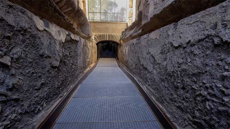 El túnel, de unos 55 metros de longitud en su estado actual, fue excavado a través de los cimientos del Coliseo y permanecía oculto a la multitud que asistía a los espectáculos. Originalmente, su extensión era mayor, pero parte de su estructura se perdió hace aproximadamente un siglo debido a la instalación de tuberías de alcantarillado.