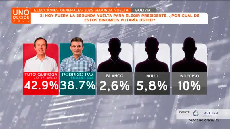 A poco más de una semana de la histórica segunda vuelta, la Red Uno de Bolivia presentó la Gran Encuesta Nacional con la pregunta principal: ‘Si hoy fuera la segunda vuelta para elegir presidente ¿por cuál de estos binomios votaría usted?'
