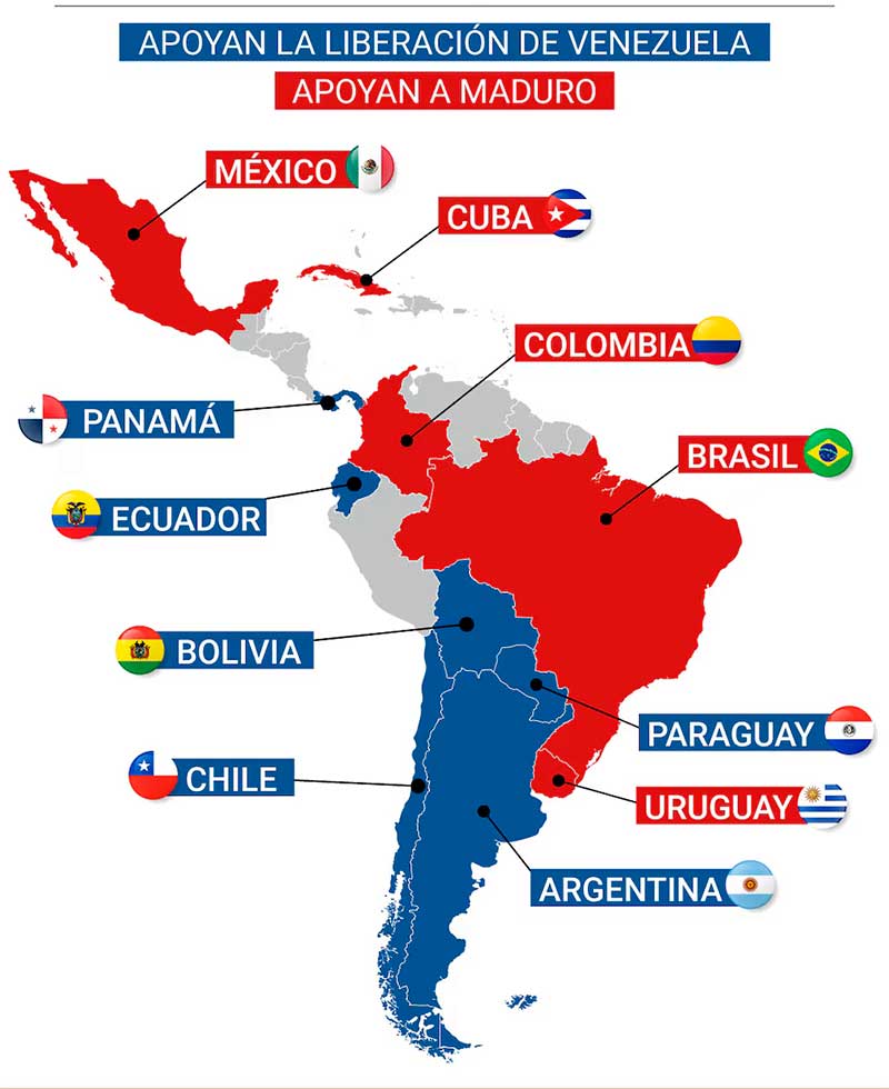 En contraste, el bloque de rechazo está encabezado por el brasileño Luiz Inácio Lula da Silva, quien calificó la captura como un "precedente extremadamente peligroso" donde prevalece la ley del más fuerte. México, bajo la administración de Claudia Sheinbaum, apeló al principio de no intervención para condenar la acción unilateral de Washington. A este grupo se unen Cuba y Colombia, cuyo mandatario, Gustavo Petro, ha mostrado una "seria preocupación" por la estabilidad fronteriza ante el nuevo escenario de administración estadounidense en Venezuela.