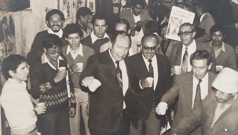 Jorge Miranda (Izquierda de blanco), junto a Jaime Humérez (centro) director de Meridiano y un nuevo producto, el vespertino Correo en 1984