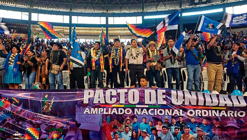 Erbol.- El ampliado del Pacto de Unidad evista, reunido este sábado en el coliseo de la Coronilla en la ciudad de Cochabamba, ratificó el estado de emergencia y aprobó un plan de movilizaciones ante la posible anulación de Evo Morales como jefe nacional del MAS-IPSP y la candidatura presidencial para el 2025.