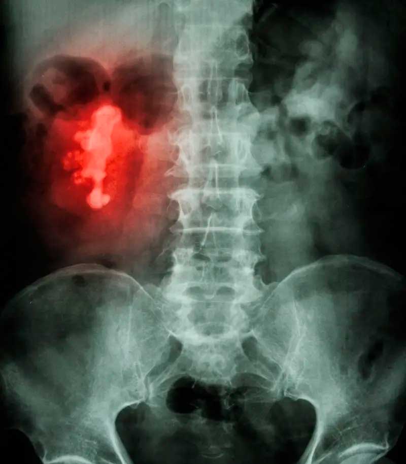 Estos cálculos causan problemas cuando obstruyen los uréteres, los dos conductos que transportan la orina desde los riñones a la vejiga. Si esto sucede, puede provocar fuertes dolores en la zona lumbar, además de impedir el flujo normal de orina. Esto, a su vez, puede causar una infección o acumulación de orina dentro y alrededor del riñón.