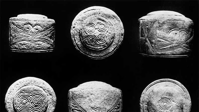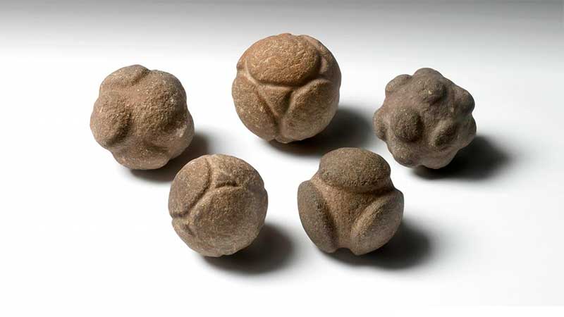 Uno de los ejemplos más fascinantes de estos enigmas son las bolas de piedra neolíticas encontradas principalmente en Escocia, que datan de entre el 3200 y el 2500 a.C. Estas esferas, meticulosamente talladas con decoraciones que van desde espirales hasta formas concéntricas, han sido descubiertas en enterramientos y asentamientos, pero rara vez son idénticas o forman parte de un conjunto. A pesar de su antigüedad y de haber sido manipuladas evidentemente, el uso original de estas bolas sigue siendo un tema de intenso debate, así como menciona Harlow: "¿Eran misiles para disuadir a depredadores y plagas? ¿Armas de guerra? ¿juguetes? ¿O tal vez pesas de medir, adornos domésticos, dispositivos mnemotécnicos, rodamientos de bolas para mover megalitos o soportes para hilos?"