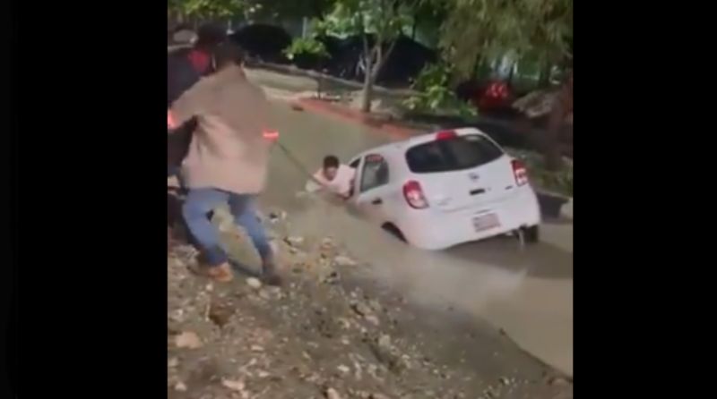 Mientras el coche se sumergía lentamente, el conductor salió por la ventana y luego, tres personas, entre ellas un uniformado municipal de tránsito, usaron una soga para sacarlo del agua y evitar que el lodo y el agua se lo tragara. La escena quedó registrada en un video que circula en redes sociales.