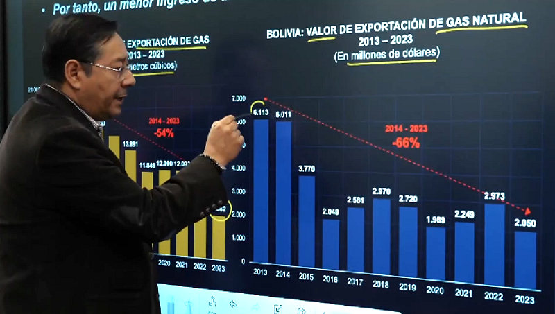 En una exposición transmitida por el canal estatal por algo más de una hora, precisó que el origen y causa de la falta de dólares y combustible en Bolivia es el descuido de la nacionalización de los hidrocarburos de 2006 con la falta de inversión en exploración, lo que llevó a la caída en la producción de combustibles y la dependencia de las importaciones.
