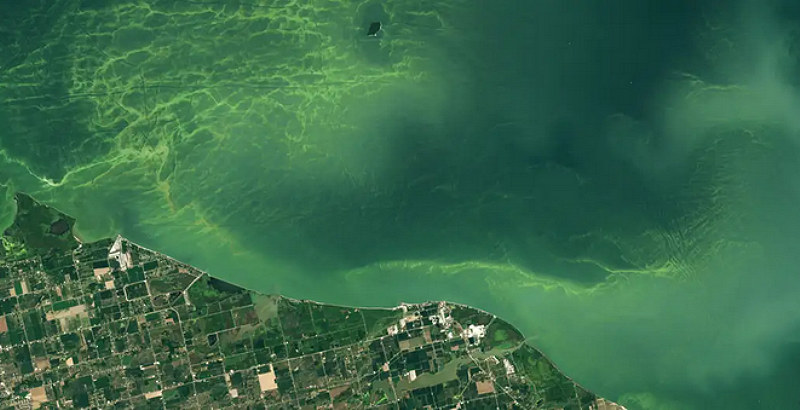 DW.- Imágenes del satélite de la NASA Landsat-9 muestran la propagación de una alga tóxica que tiñe de un intenso color verde esmeralda el lago Erie, el cuarto lago más grande de Norteamérica.