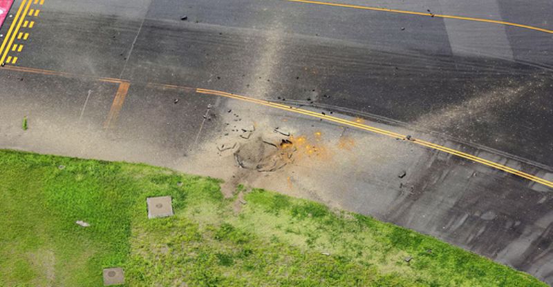 Un video grabado por una escuela de aviación cercana mostró la explosión arrojando pedazos de asfalto al aire como una fuente. Los videos transmitidos por la televisión japonesa mostraron un cráter en la pista de rodaje de unos 7 metros de diámetro y 1 metro de profundidad.