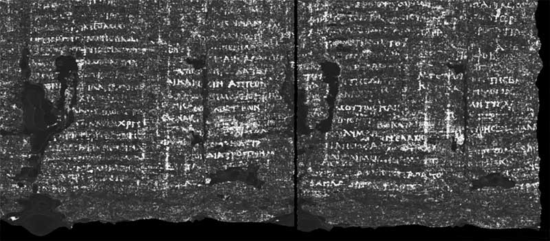 El calor y las cenizas volcánicas del Vesubio destruyeron la ciudad y preservaron los pergaminos, pero en un estado ilegible, convirtiéndolos en frágiles bloques carbonizados que se desintegran si se desenrollan físicamente.