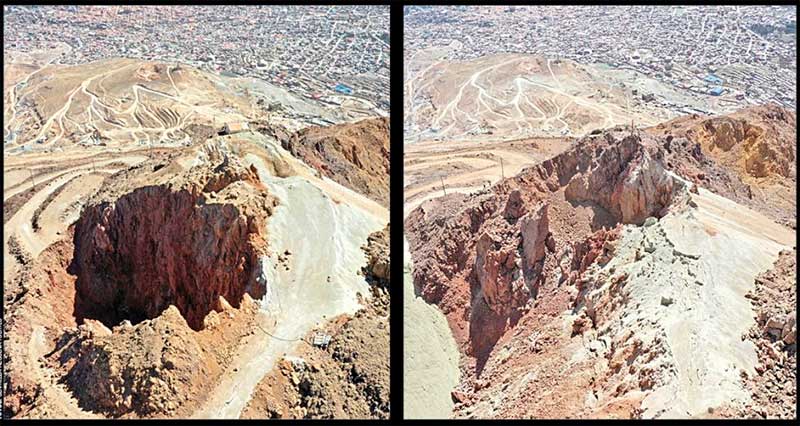 Dicen que los hundimientos H-1 y H-3 están exactamente detrás de la cúspide y se están incrementando tanto en volumen y profundidad aceleradamente debido a la intensa explotación minera, en tanto que la Comibol no está controlando de manera efectiva la extracción de minerales de la base de los hundimientos.