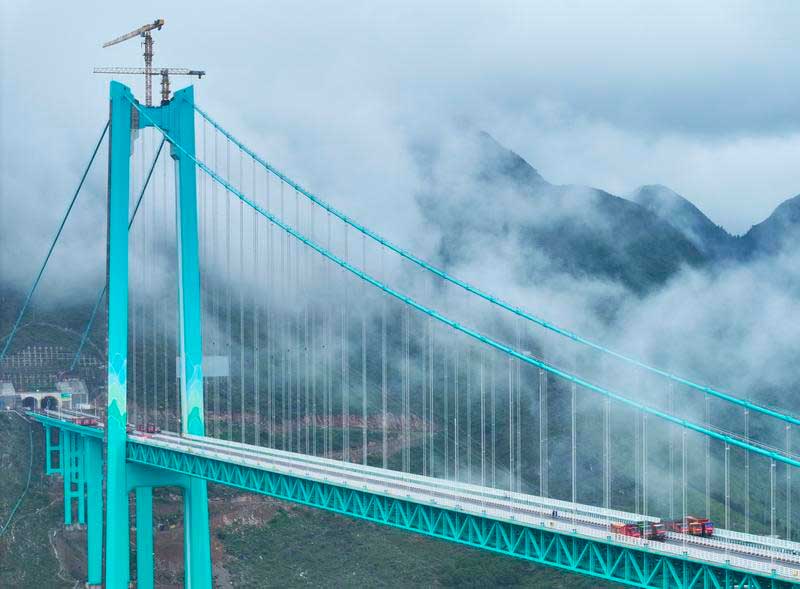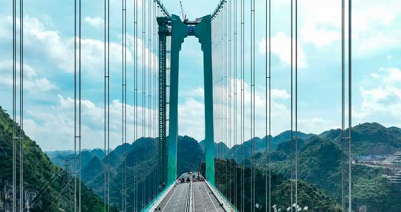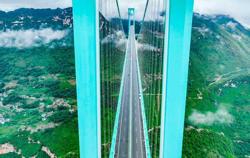 Con una envergadura de su soporte principal de 1.420 metros, el proyecto se ha convertido en el puente colgante de celosía de acero con el vano más largo del mundo en terreno montañoso, según las autoridades provinciales de Guizhou.