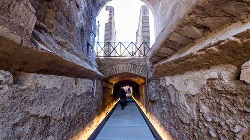 El túnel, de unos 55 metros de longitud en su estado actual, fue excavado a través de los cimientos del Coliseo y permanecía oculto a la multitud que asistía a los espectáculos. Originalmente, su extensión era mayor, pero parte de su estructura se perdió hace aproximadamente un siglo debido a la instalación de tuberías de alcantarillado.