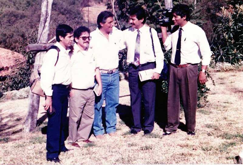 Jorge Miranda (Izquierda de blanco), junto a Jaime Humérez (centro) director de Meridiano y un nuevo producto, el vespertino Correo en 1984